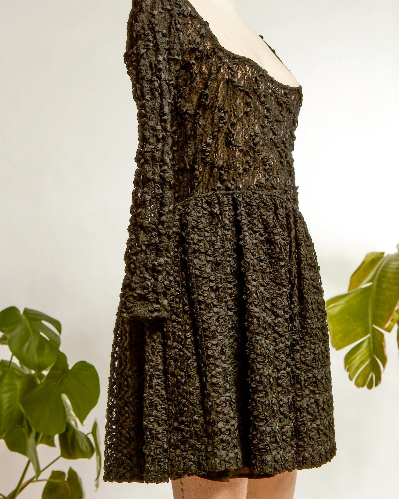 An early Anna Sui Madonna Era Baby Doll nightclub dress! Early East Village Goth Punk Grunge Dress. Such an incredible fabric, super textured with soutache style stretch lace over black lining. Top not lined--only skirt. Excellent collectible condition.