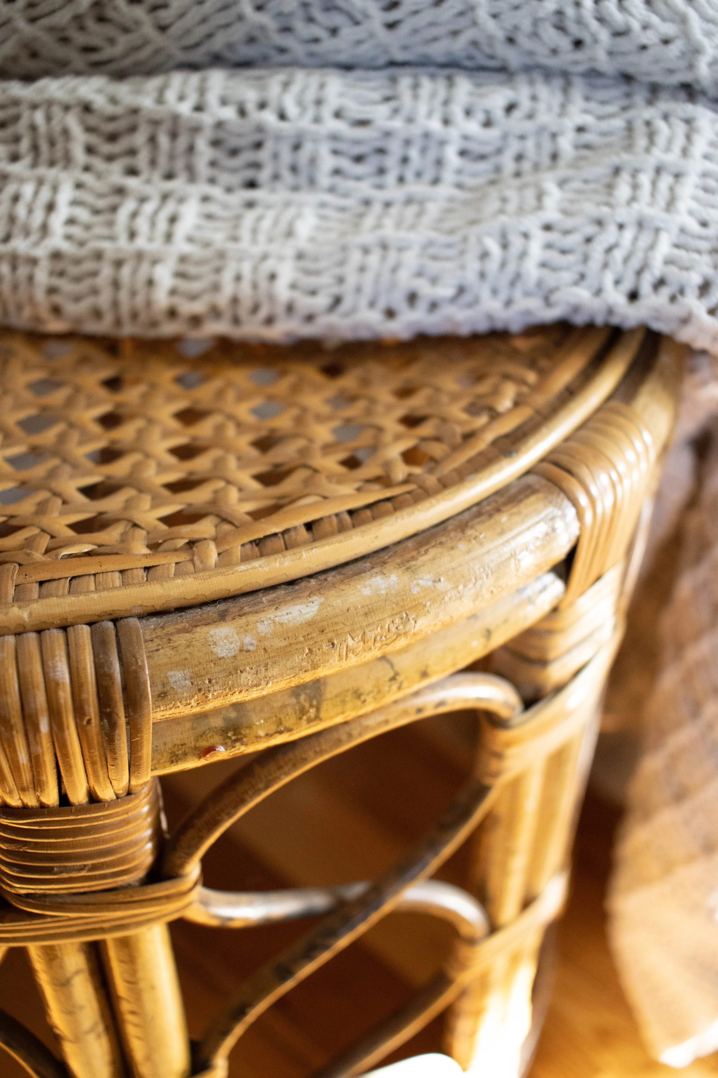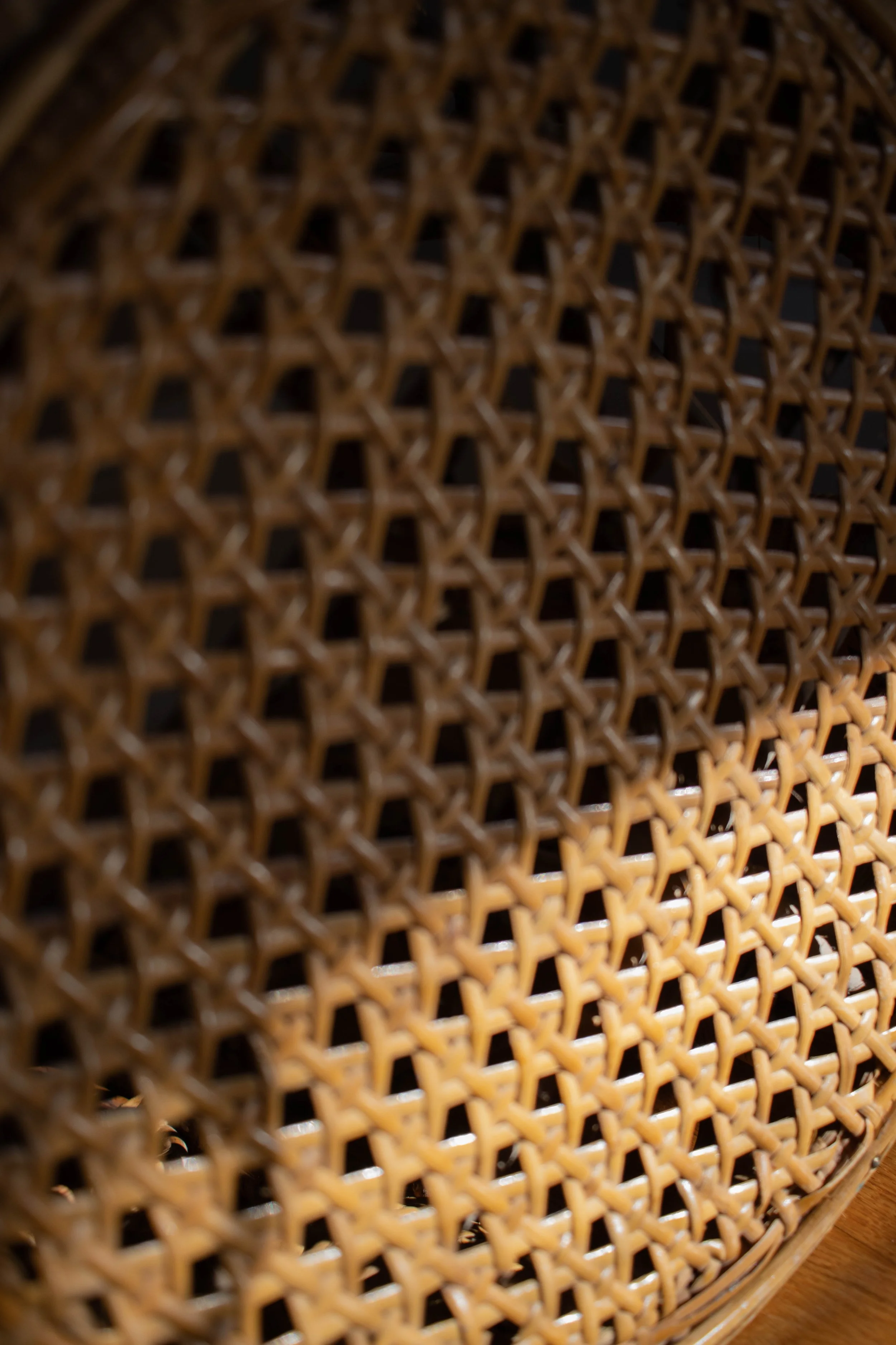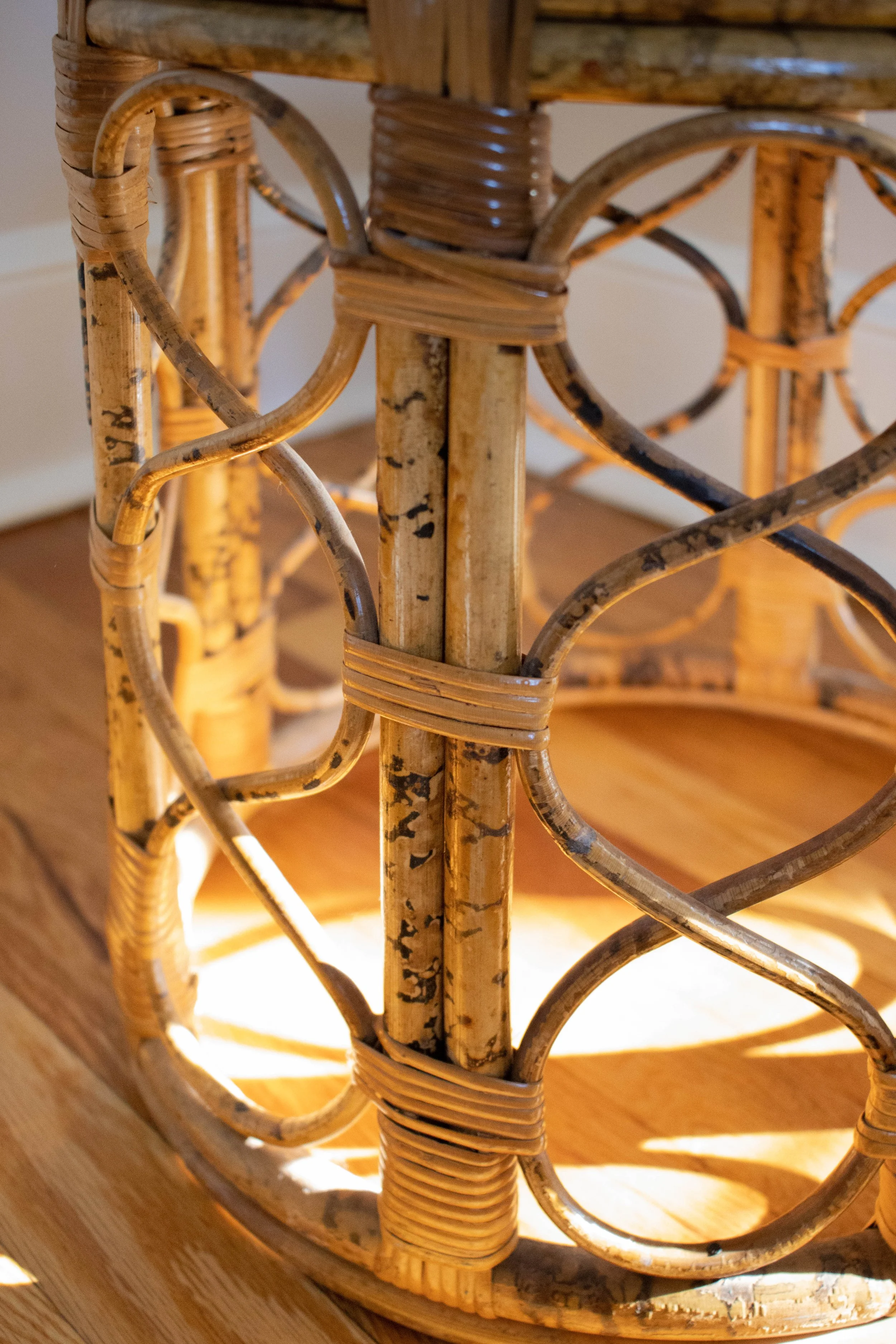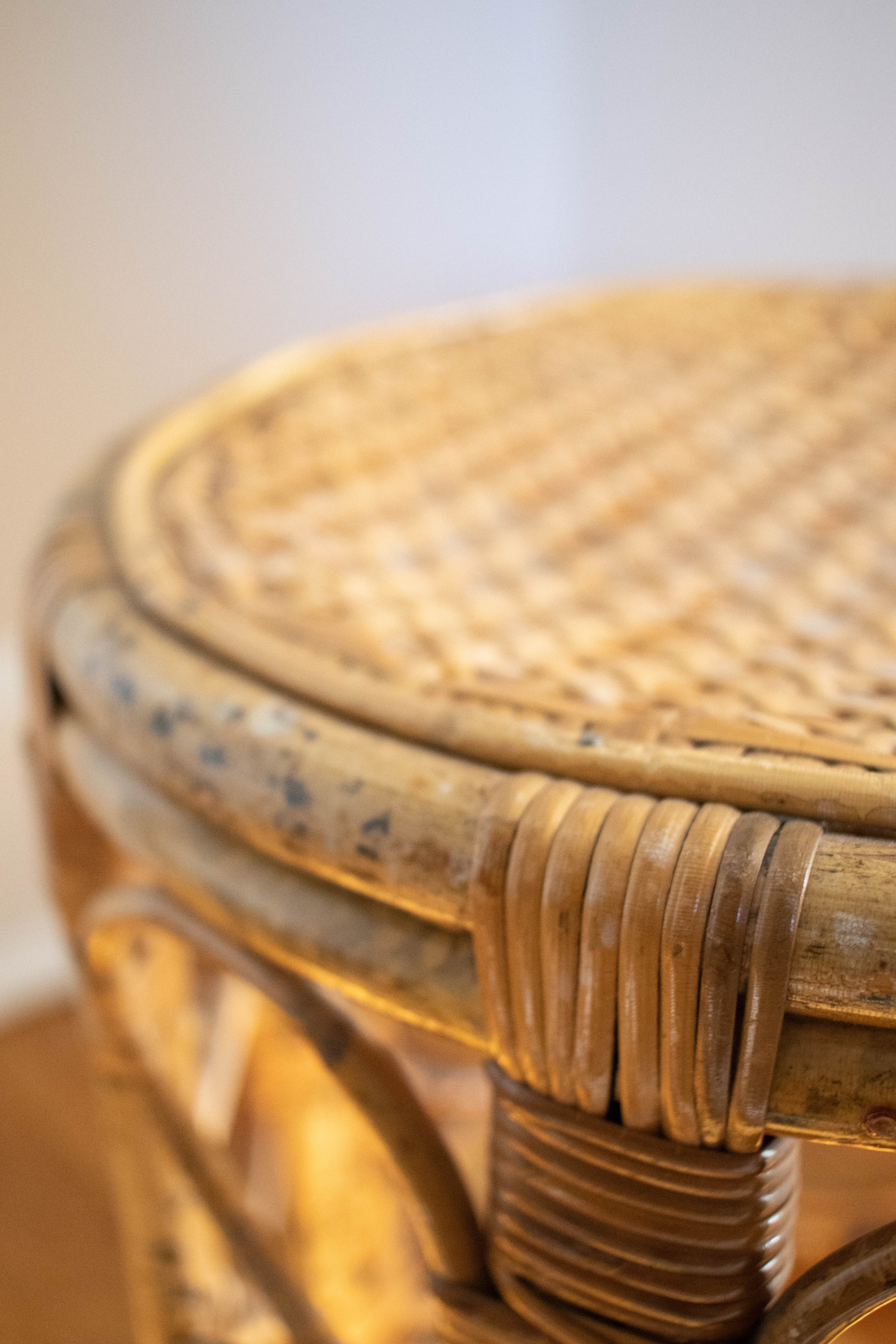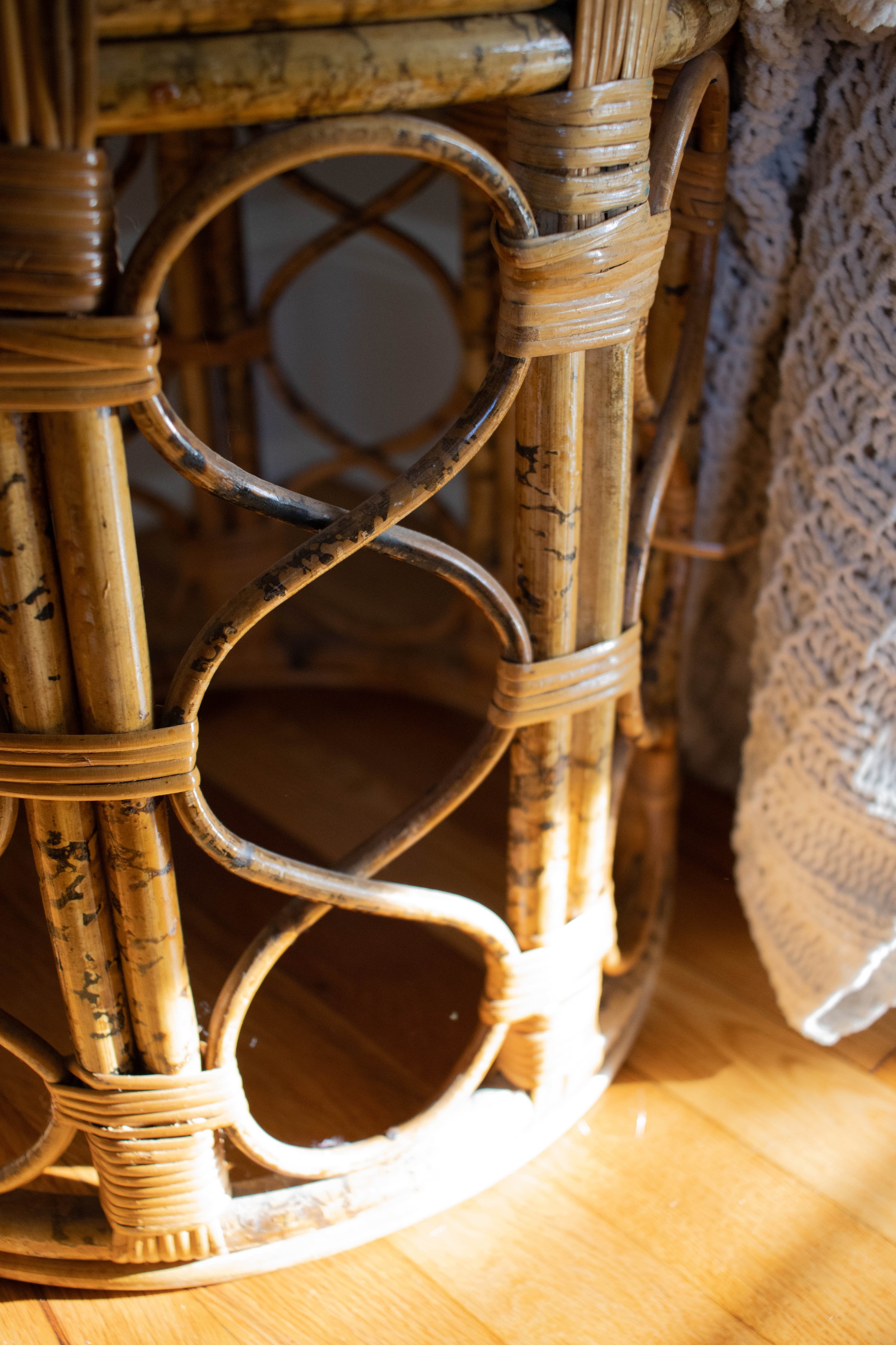 A superb mid-century rattan & bamboo side table circa 1960. This is a stylish round accent table with wicker caned woven top and elegant bentwood details. The table also features a tortoiseshell patina finish that adds to the depth and value of the piece. Can be used as an end table, drinks table, accent table, bedside table, (shown as a storage basket) or wherever your imagination takes you! Top it with round glass for even more functionality. 16ʺ H × 14” D.